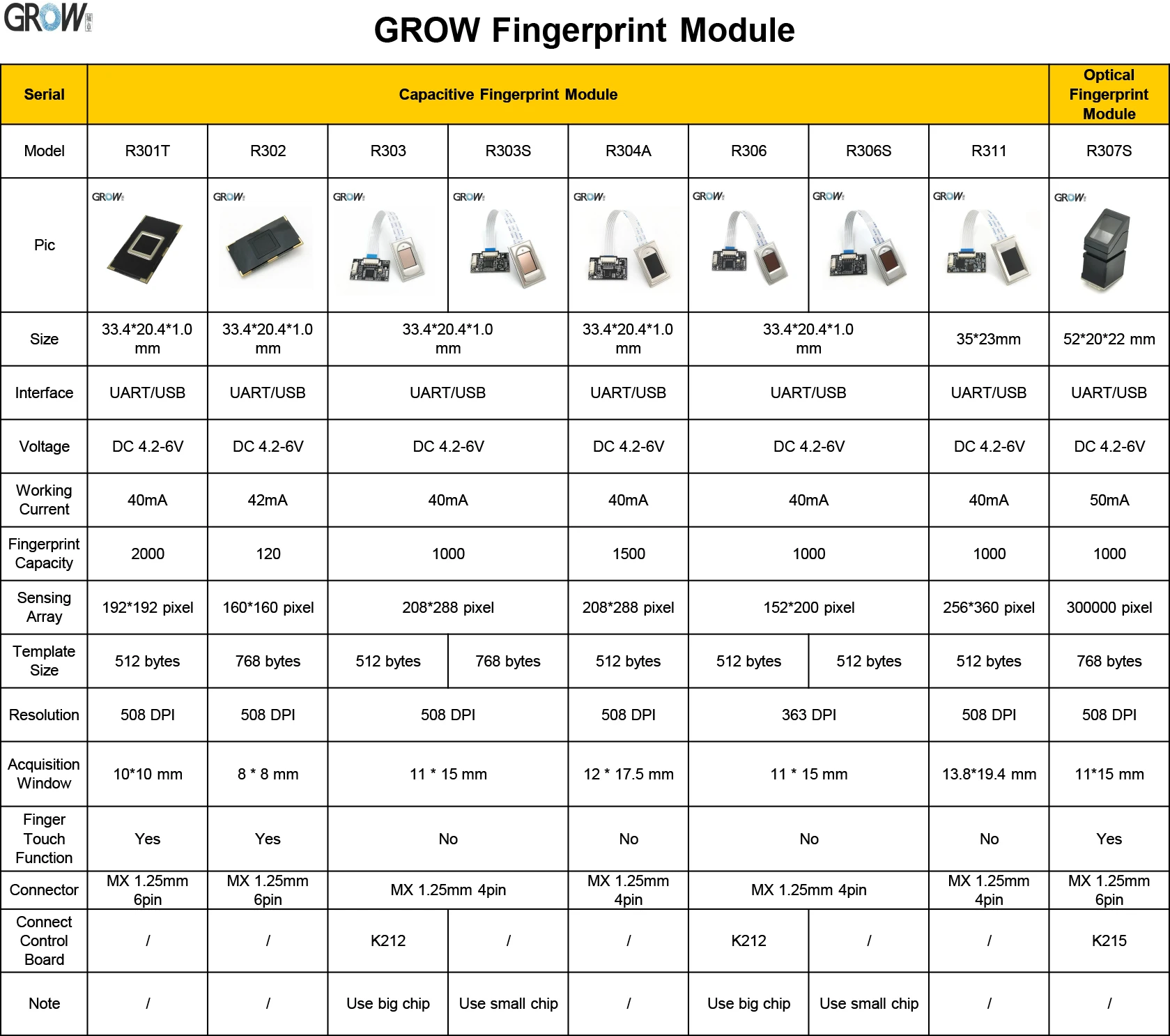GROW R304A DC4.2-6V 208*288 Pixel Fingerprint Module Scanner Reader Free SDK With 1500 Capacity For Arduino Windows Android