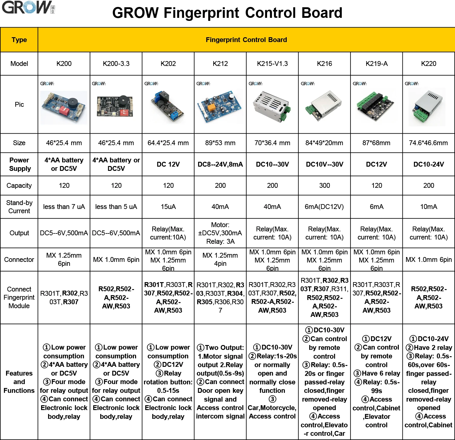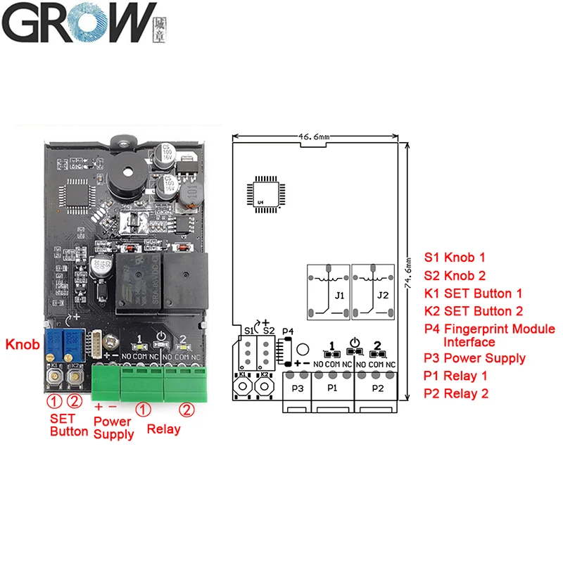 GROW K220+R503 DC10-24V Two Relay Output With Administrator/User Fingerprint Access Control Board 0.5s-60s-Normally Open Relay
